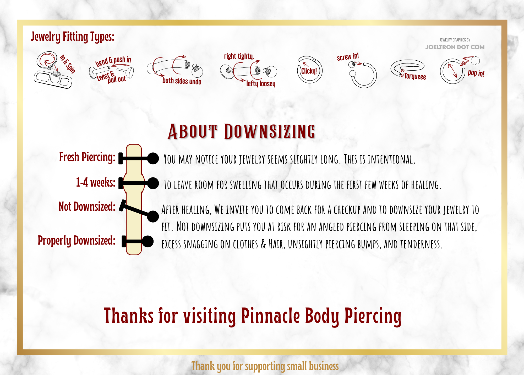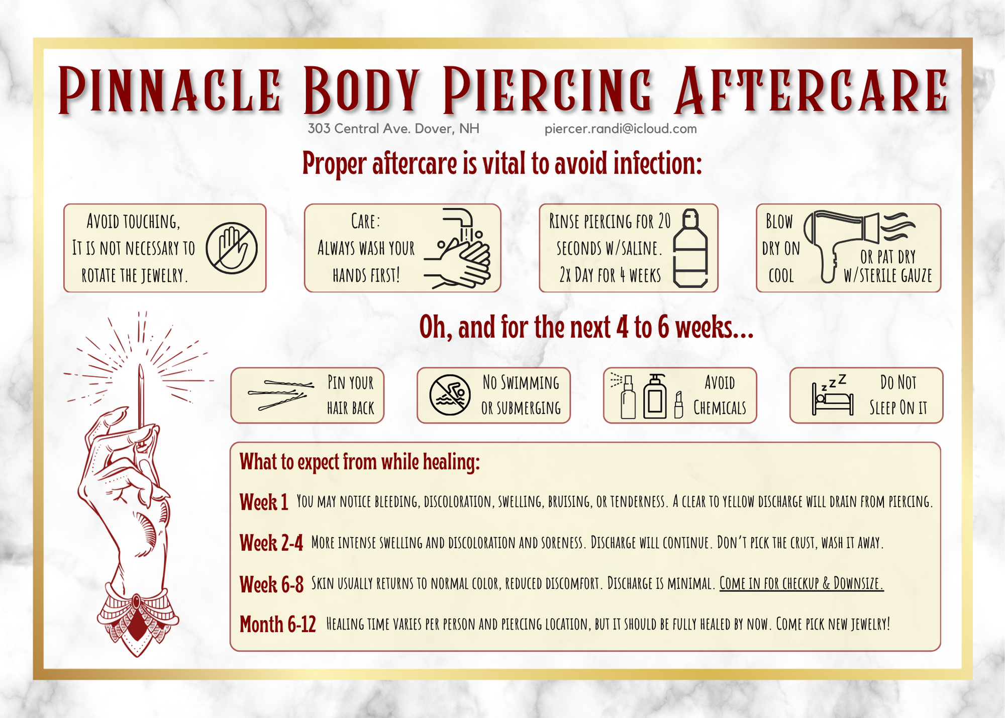 Piercings can be tricky and these guidelines do not match recommendations for EVERY piercing and person. Please take note of the instructions given to you during your appointment. This template is for use this as a basic guideline. These suggestions do not replace medical advice from a doctor or medical professional.